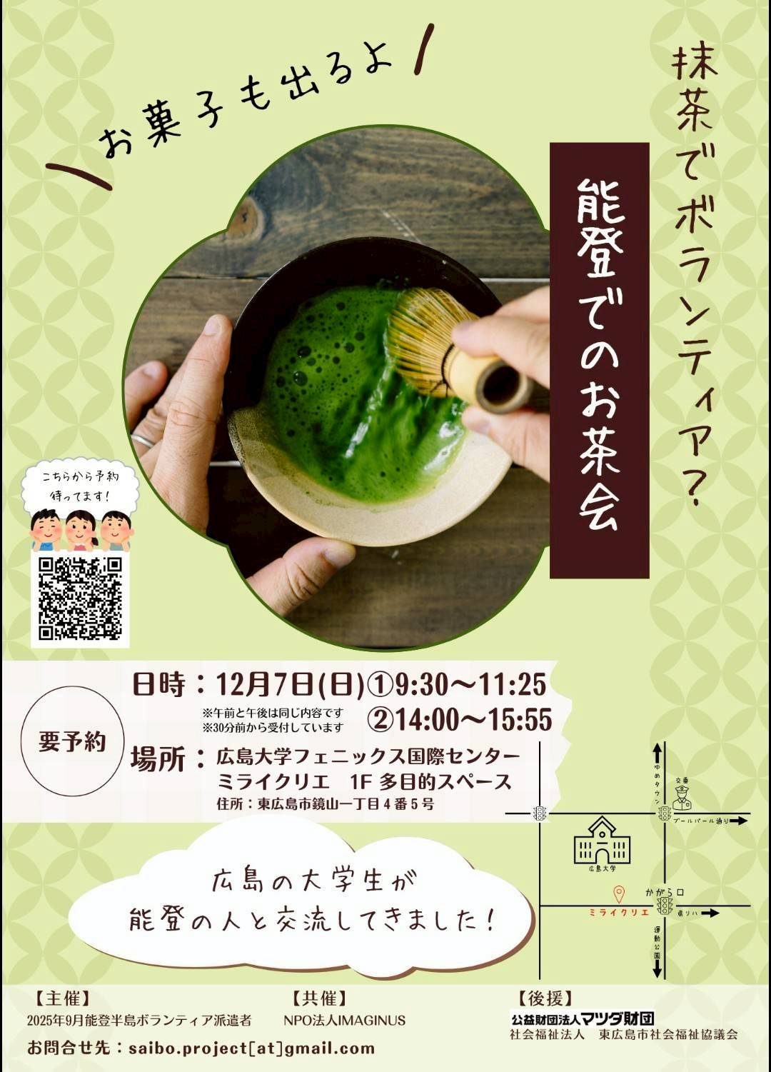 お申込みはHPの申込ボタン(申込メールアドレス)からどうぞ!9月、10月の活動報告は@A★ NPO法人IMAGINUS からイベント「抹茶でボランティア?能登のお茶会2025」12月7日のお知らせです。詳しくは@A