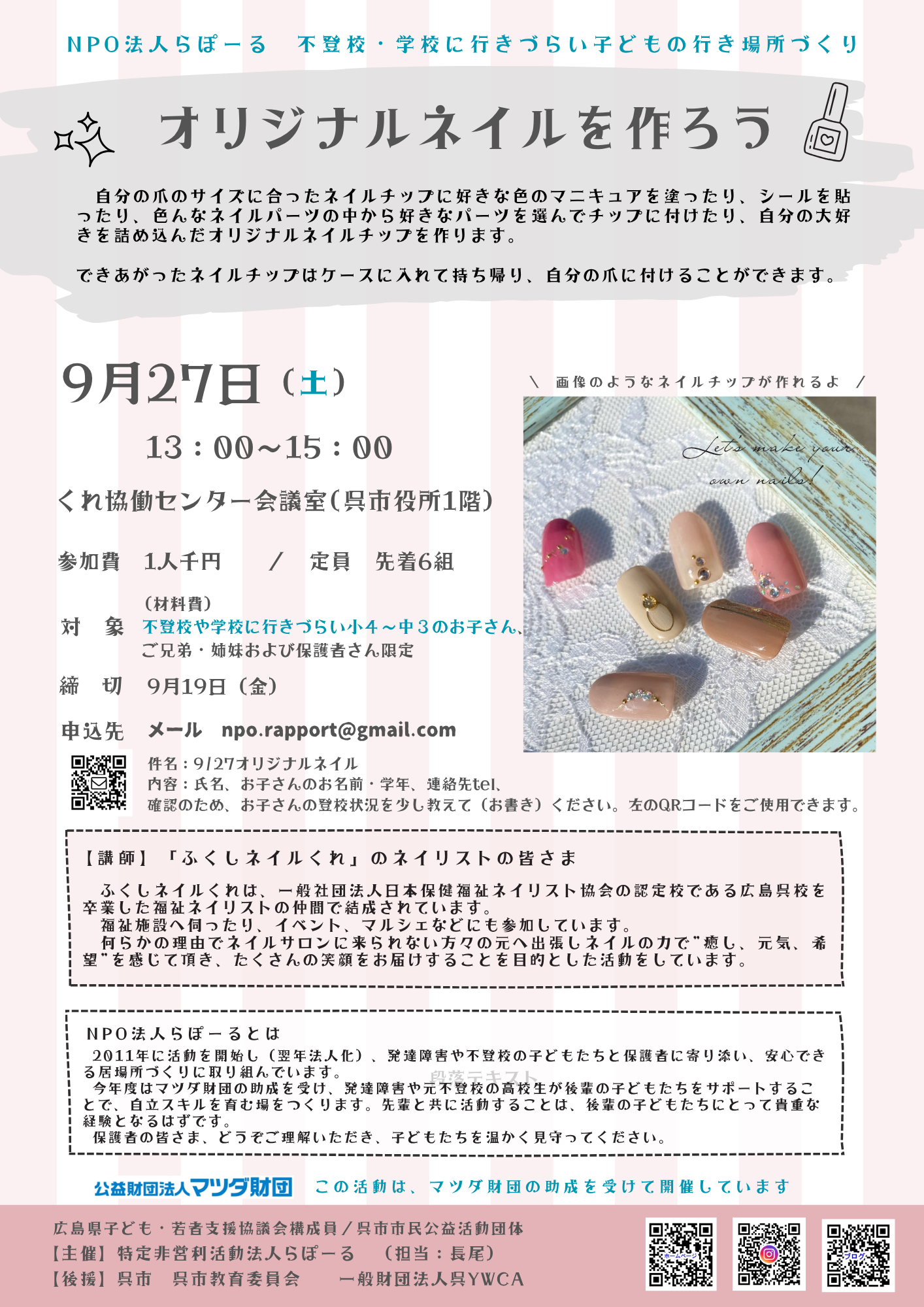 ●2019年9月21日(土) 広島市中区で行われた「ピアサポート子育てセンター」の子どもたちに夢と希望を!プロジェクトを見学しました。詳しくはこちら! 2019.10.2